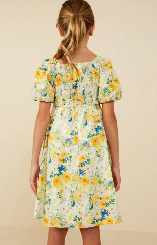Girls Garden Floral Print Puff Sleeve Dress