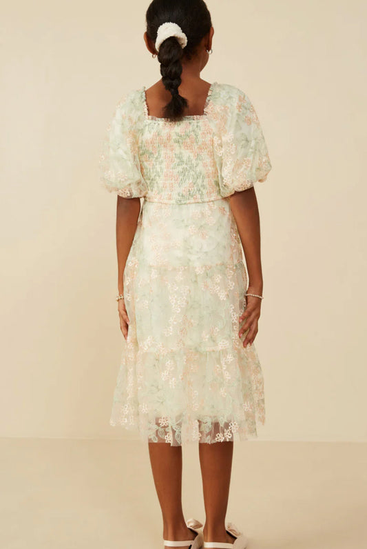Girls Smocked Floral Mesh Lace Tiered Dress