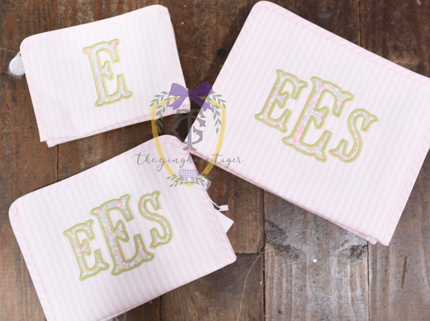 Initials for the font pictured should be listed as first, last, middle. To be safe, list the full name! the first photo is Finley applique font the second photo is Smith Applique font.
